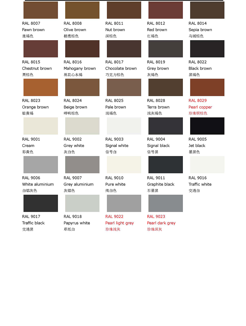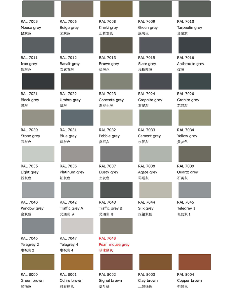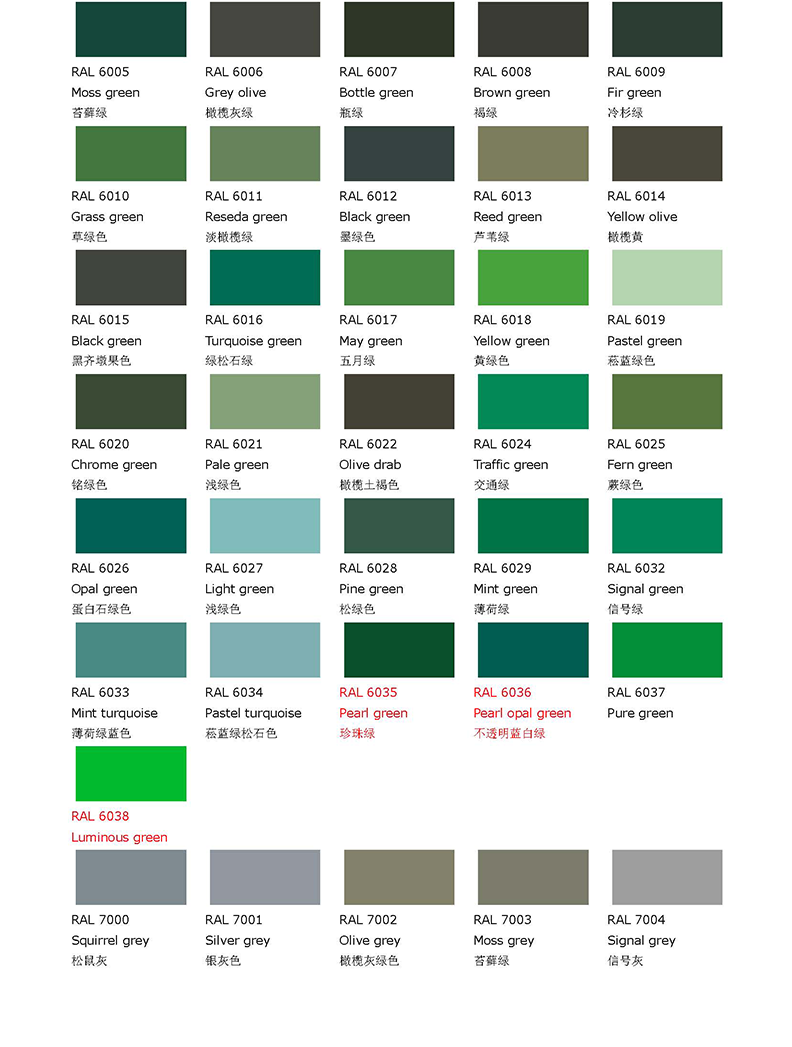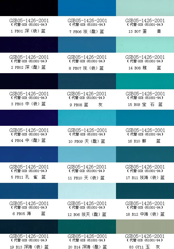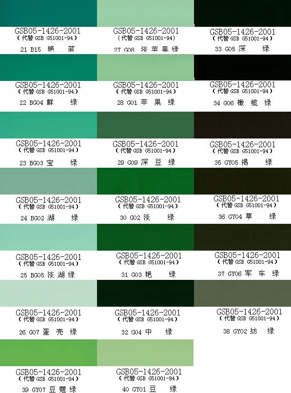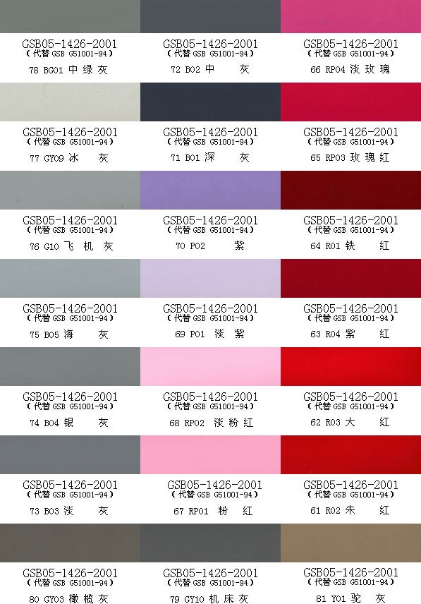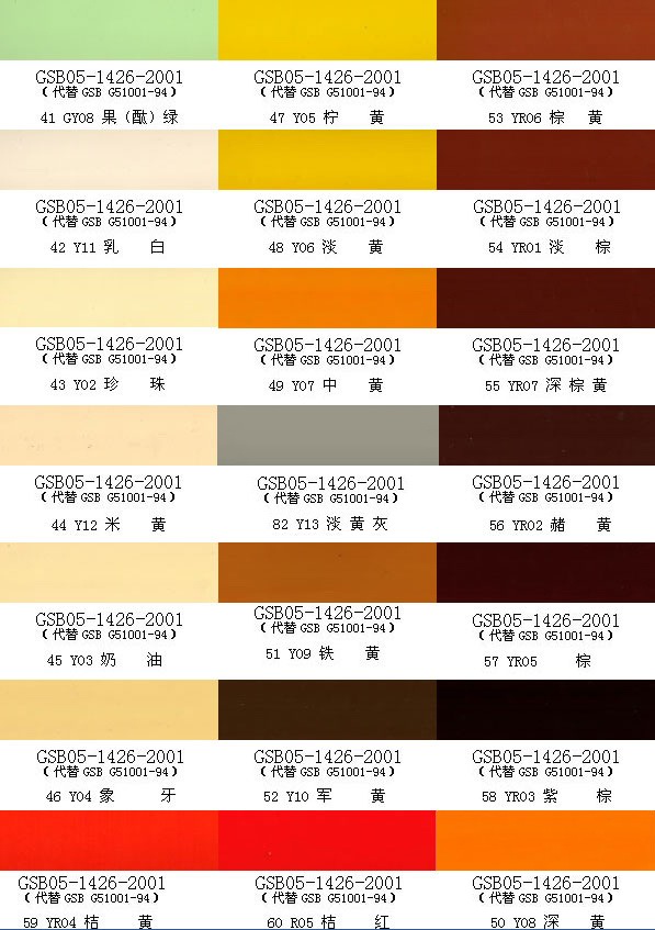 本公司標(biāo)準(zhǔn)顏色代碼與其它標(biāo)準(zhǔn)顏色代碼無直接聯(lián)系。如需其它標(biāo)準(zhǔn)顏色的對(duì)應(yīng)顏色,請(qǐng)咨詢本公司。如需常用顏色,請(qǐng)參見本公司的色卡。第五位數(shù)字可用于表示具有相同顏色,但由于各種原因(例如為了符合標(biāo) 準(zhǔn)或(當(dāng)?shù)兀┓梢螅┒捎貌煌伭系奶貏e配方。數(shù)字0、1、2、3 和4表示一種標(biāo)準(zhǔn)的無鉛配方,數(shù)字5、6、7、8和9表示使用含鉛顏料的產(chǎn)品。字母“Z”表示使用符合ASTM D520中第II 類鋅粉的鋅底漆。